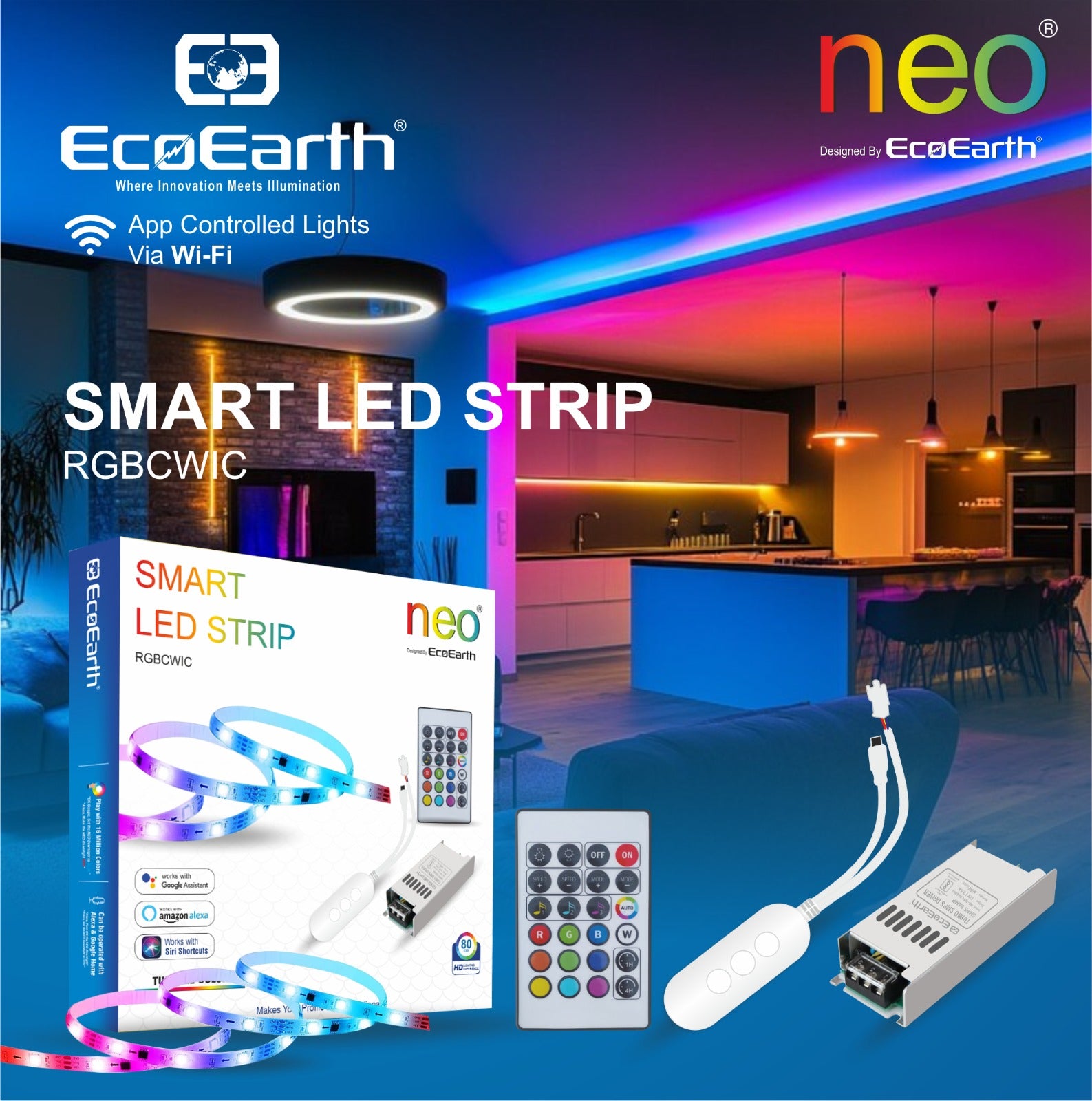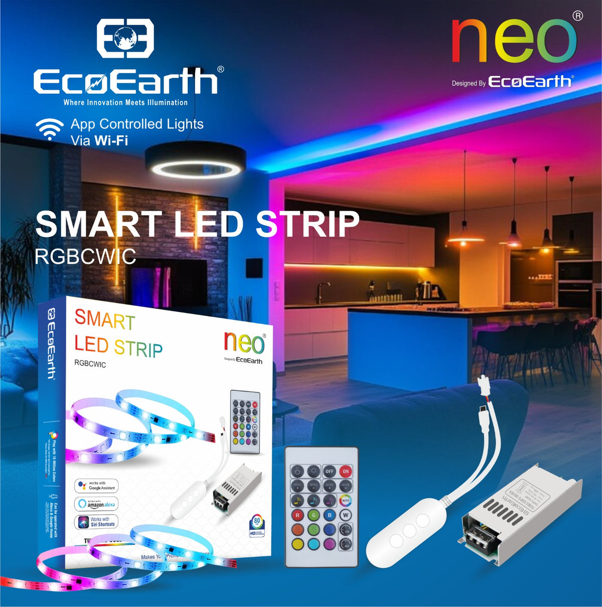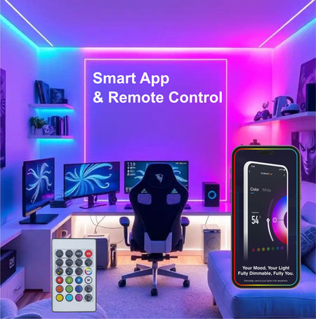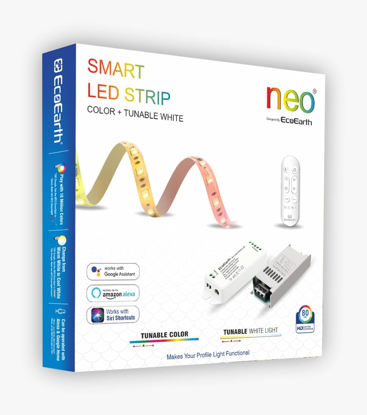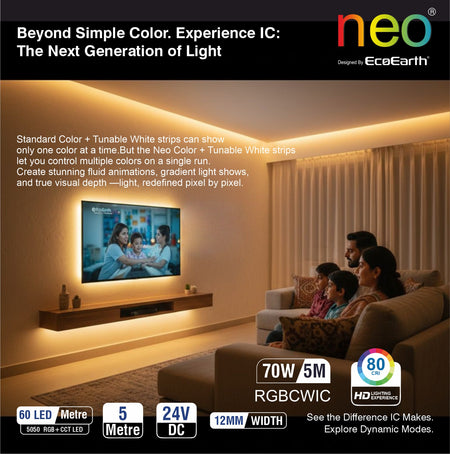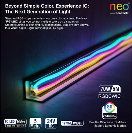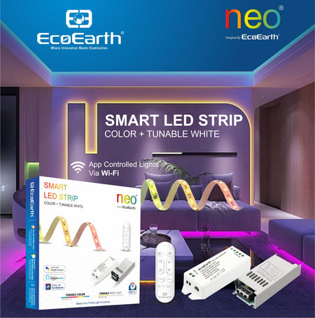 EcoEarth NEO Smart LED Strip Light delivers RGB color and tunable white lighting in one 5-meter kit. Control brightness, color, and warmth through the mobile app, voice commands, or RF remote. Features music sync technology that adjusts lighting to your audio. Ideal for home offices, entertainment spaces, or ambient room lighting.