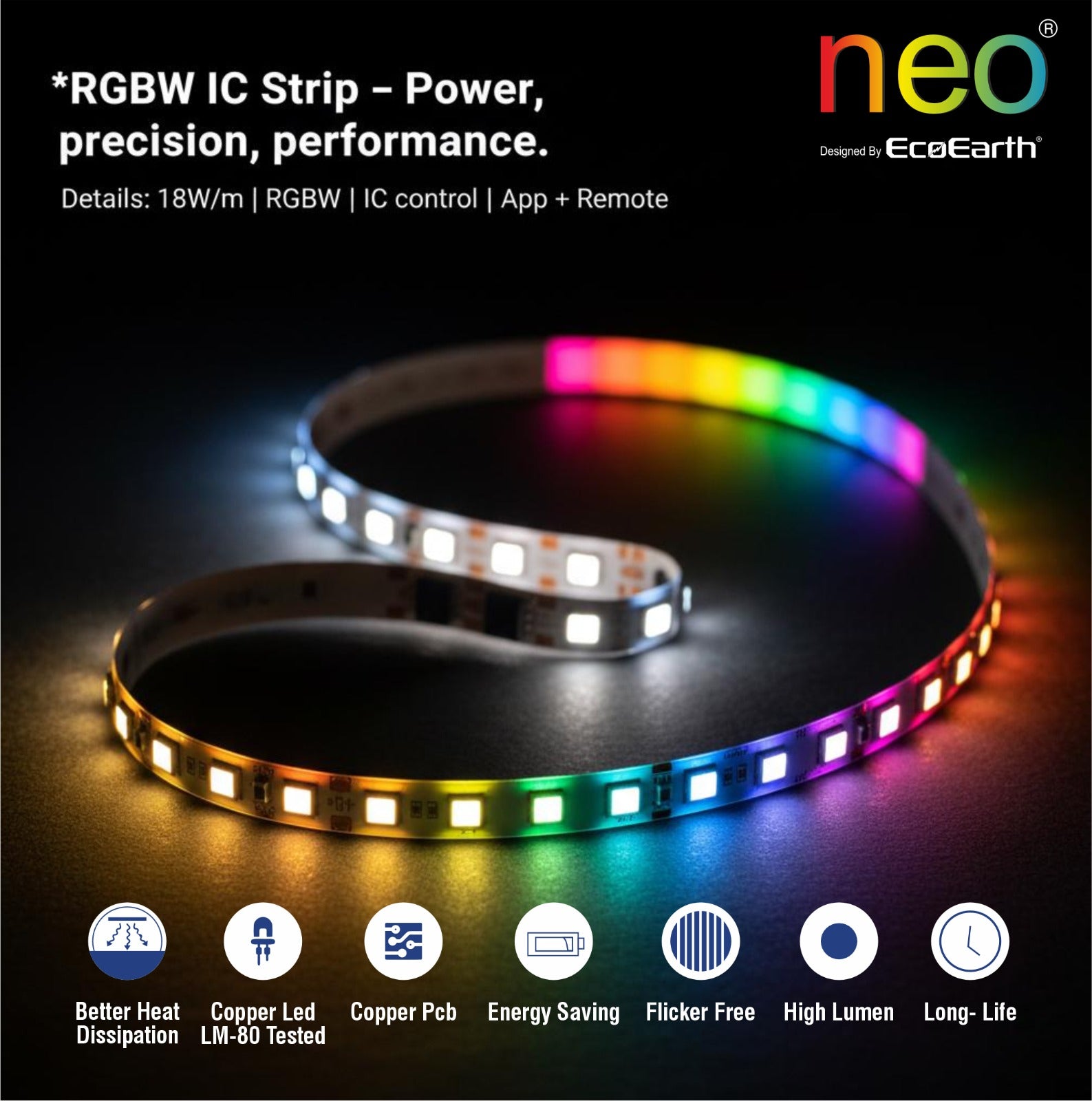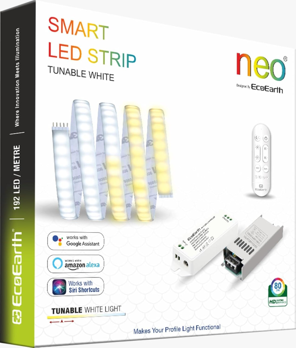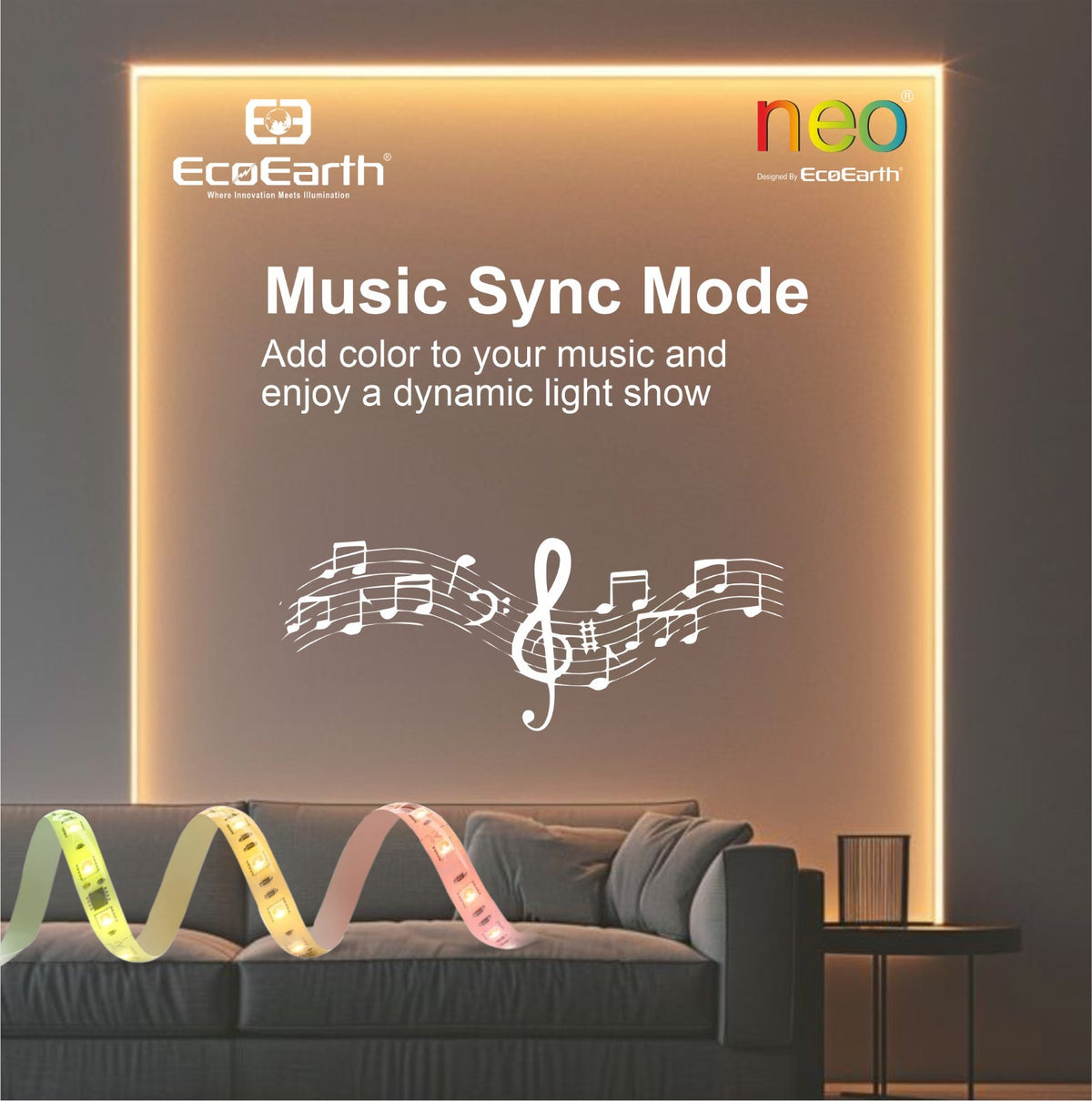 EcoEarth NEO Smart LED Strip Light delivers RGB color and tunable white lighting in one 5-meter kit. Control brightness, color, and warmth through the mobile app, voice commands, or RF remote. Features music sync technology that adjusts lighting to your audio. Ideal for home offices, entertainment spaces, or ambient room lighting.