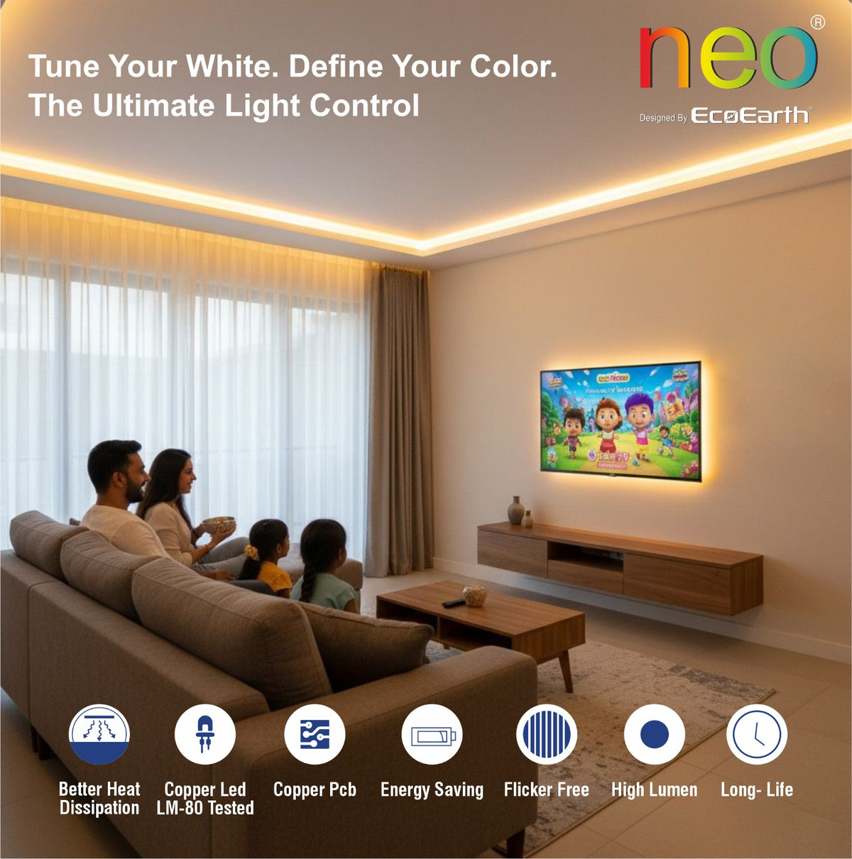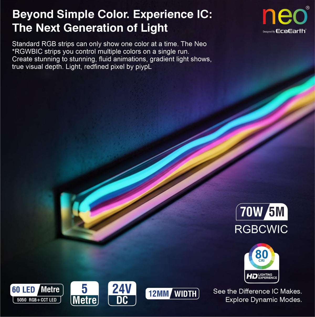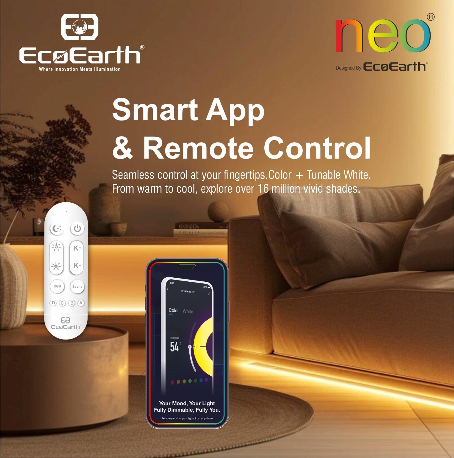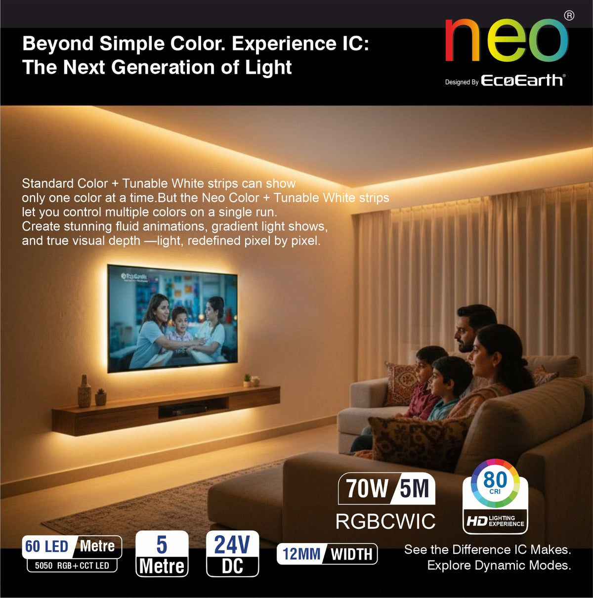 EcoEarth NEO Smart LED Strip Light delivers RGB color and tunable white lighting in one 5-meter kit. Control brightness, color, and warmth through the mobile app, voice commands, or RF remote. Features music sync technology that adjusts lighting to your audio. Ideal for home offices, entertainment spaces, or ambient room lighting.